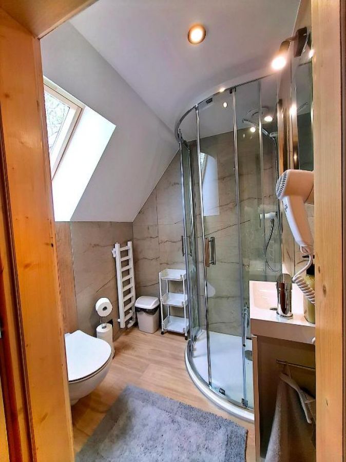 - Na piętrze, łazienka z prysznicem, sypialnia z łóżkiem małżeńskim dla 2 osób, sypialnia z trzema łóżkami jednoosobowymi dla 3 osób.